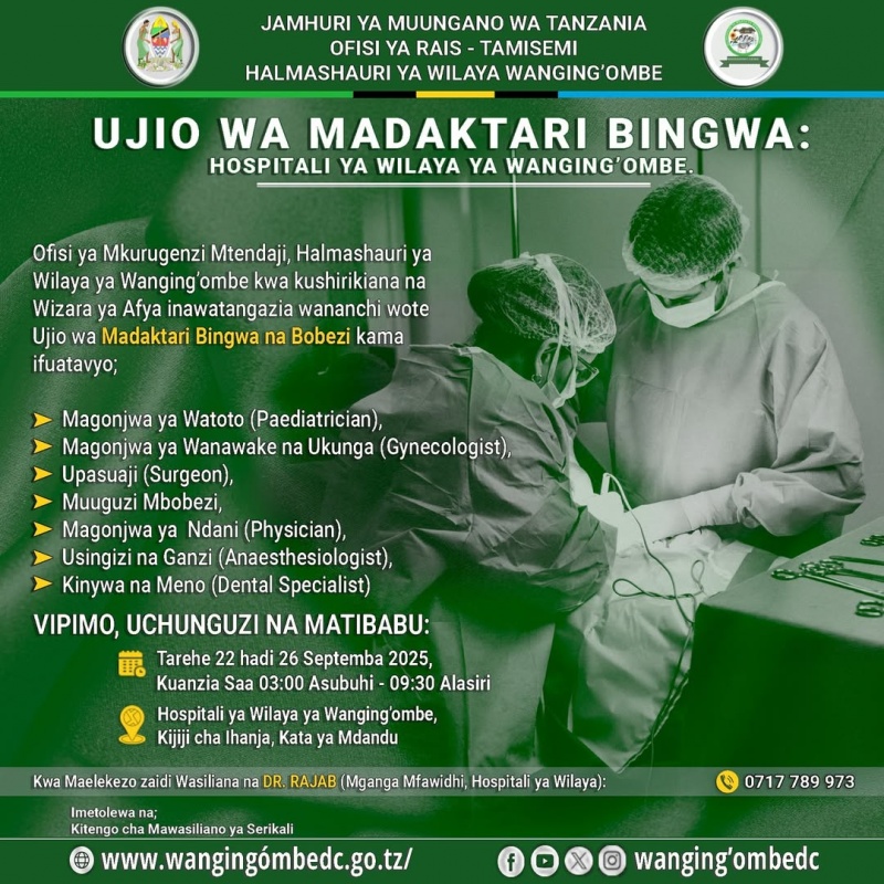 MKURUGENZI Mtendaji wa Halmashauri ya Wilaya ya Wanging'ombe kwa kushirikiana na Wizara ya Afya anawatangazia wananchi wote ujio wa Madaktari Bingwa na Bobezi kama ifuatavyo: