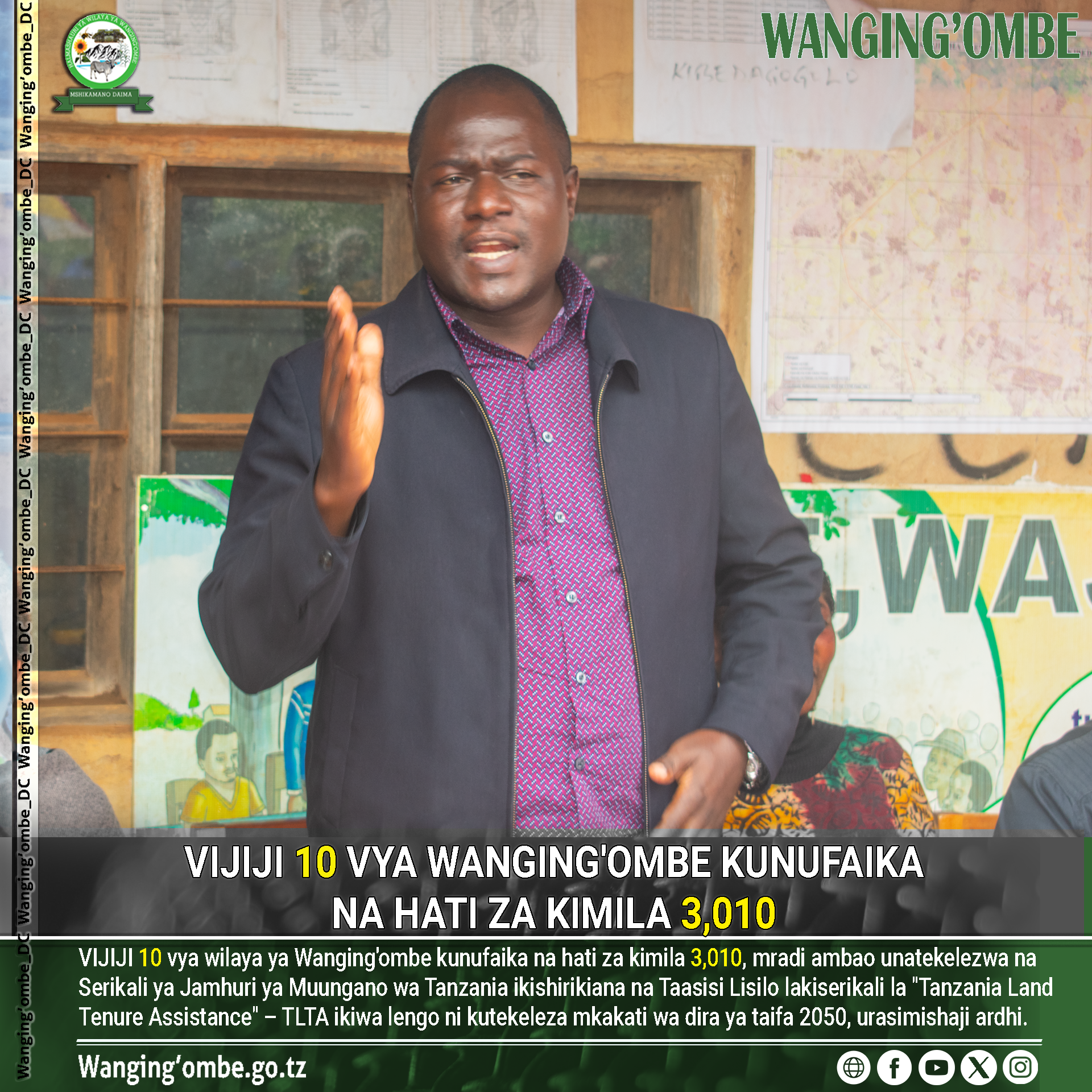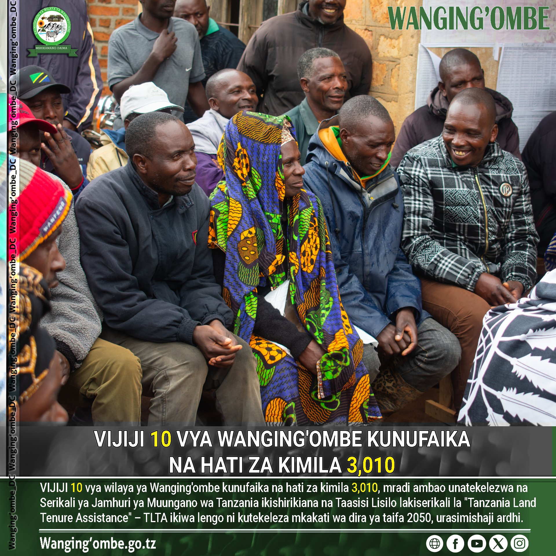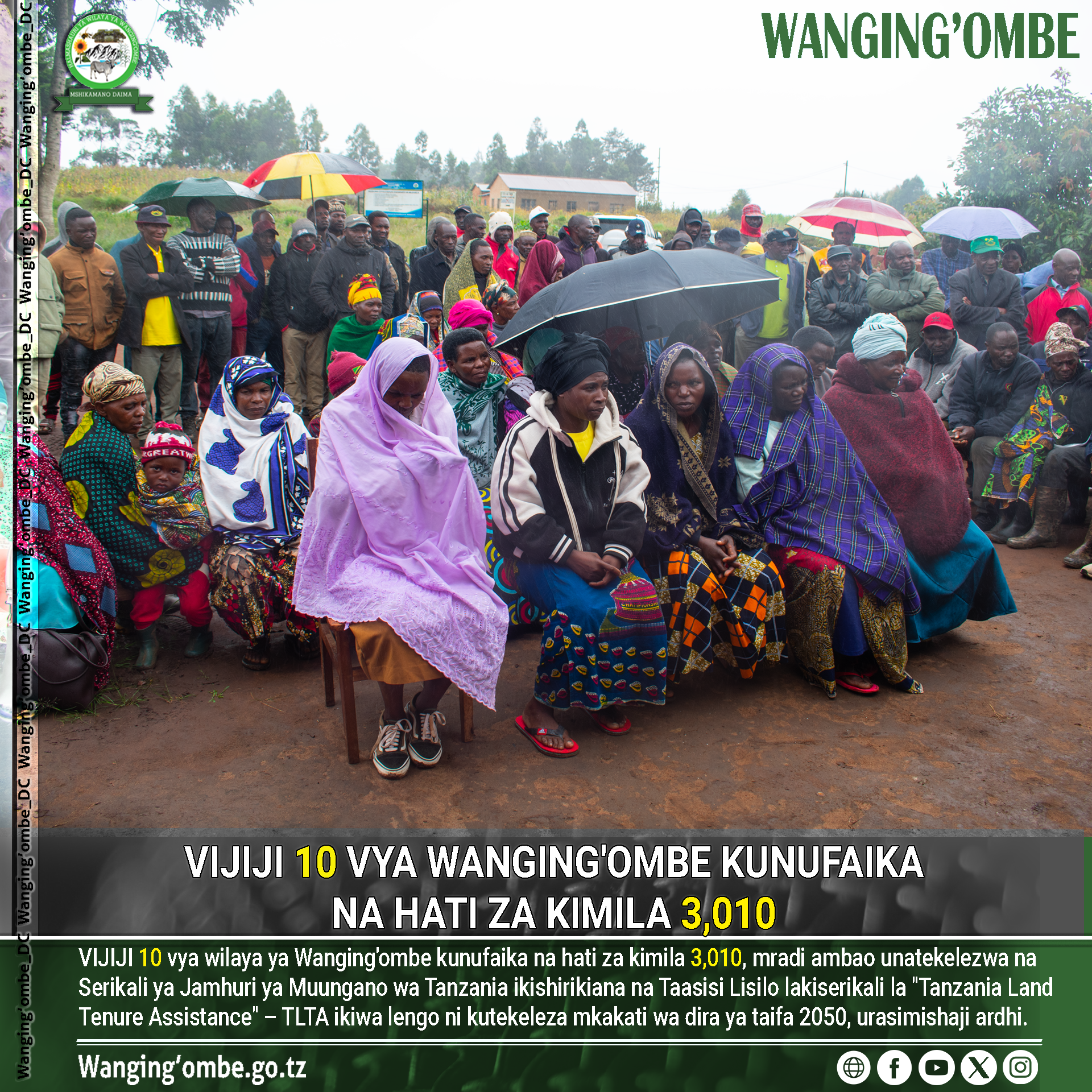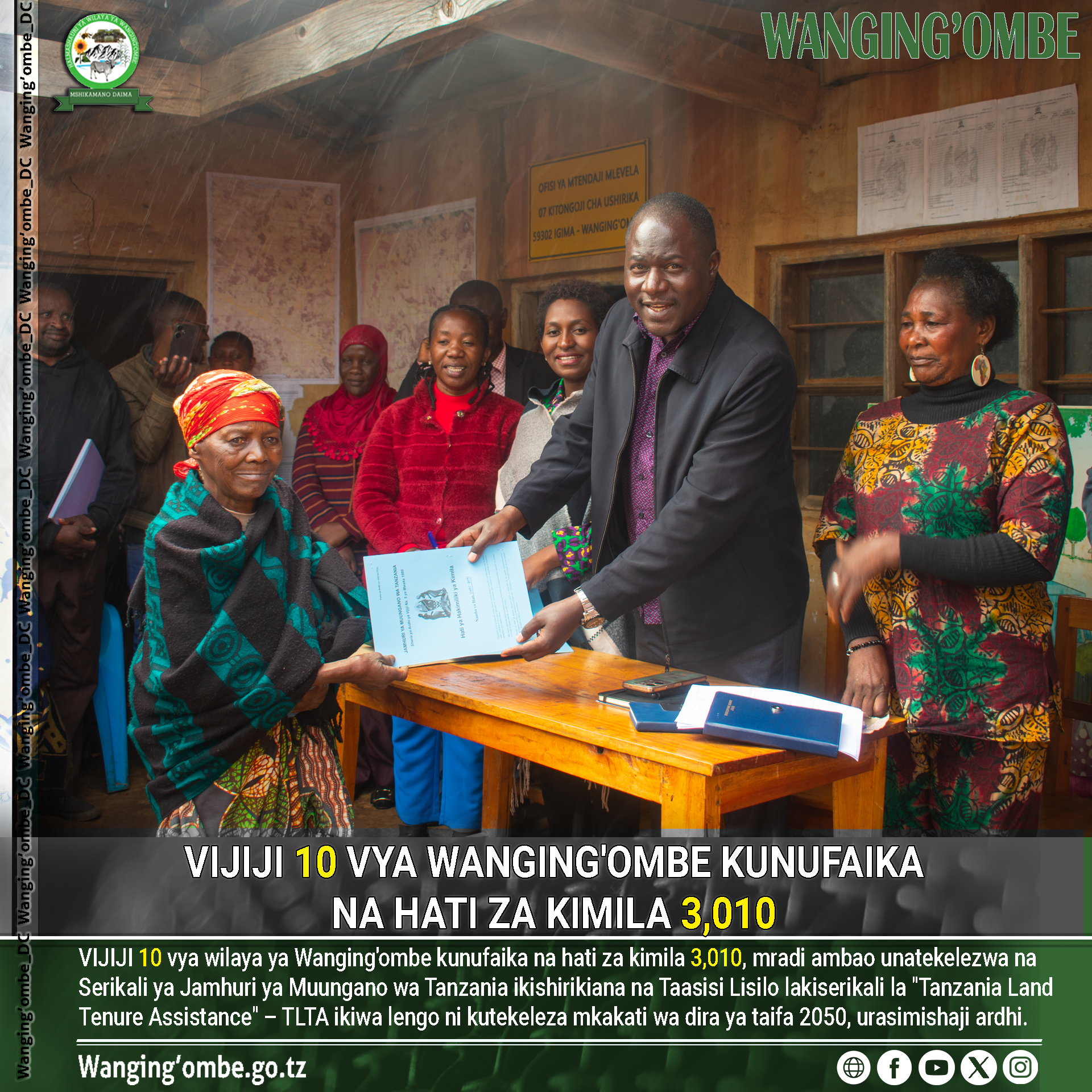 VIJIJI 10 vya wilaya ya Wanging'ombe kunufaika na hati za kimila 3,010, mradi ambao unatekelezwa na Serikali ya Jamhuri ya Muungano wa Tanzania ikishirikiana na Taasisi Lisilo lakiserikali la "Tanzania Land Tenure Assistance" – TLTA ikiwa lengo ni kutekeleza mkakati wa dira ya taifa wa kurasimisha ardhi yote ifikapo 2050.