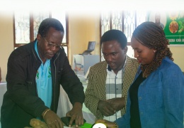 MKUU wa Divisheni ya Kilimo, Mifugo na Uvuvi, Bw. Samson Kapange (Kushoto Pichani) akiendelea kutoa elimu ya uchakataji wa wine za nyanya na matunda asili kama "Misasati" kwa wageni waalikwa Katibu Ta...