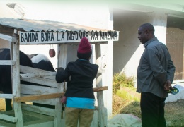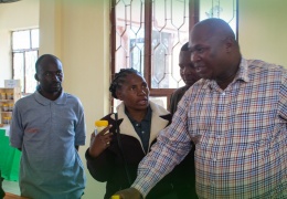 MKUU wa Divisheni/Idara ya Mipango, Wanging'ombe, Bw. Heri Kuria (Kulia Pichani) akihoji baadhi ya maswali kuhusu umuhimu wa kutumia bidhaa zitokanazo na Soya, zinazotengenezwa na Kikundi cha Upendo A...