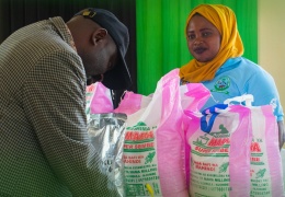 MKUU wa Divisheni/Idara ya Elimu Msingi na Awali, Wanging'ombe, Bw. Zuberi Karugutu (Kushoto Pichani) akiendelea kujiandikisha baada ya kununua Unga bora wa lishe, unaotengenezwa na Kikundi cha Wakina...